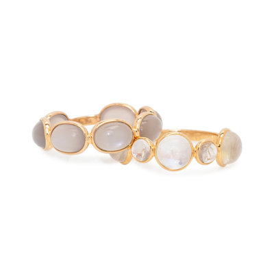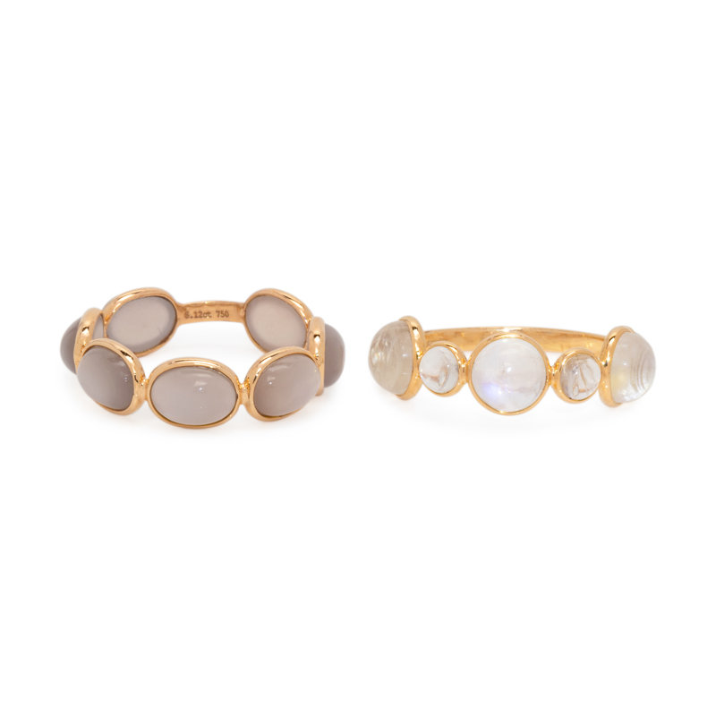 Consisting of a ring containing seven round cabochon moonstones, together with a ring containing seven oval cabochon grey moonstones. Mounted in yellow gold. Ring size 7.