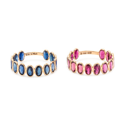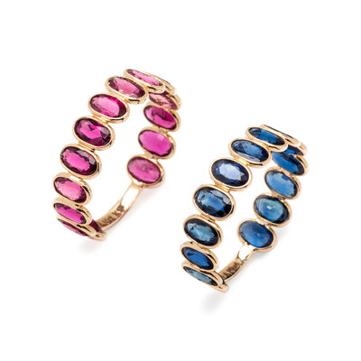 Consisting of a ring containing 14 oval mixed cut sapphires, together with a ring containing 14 oval mixed cut pink tourmalines. Mounted in yellow gold. Ring sizes 6 and 6 1/4.
