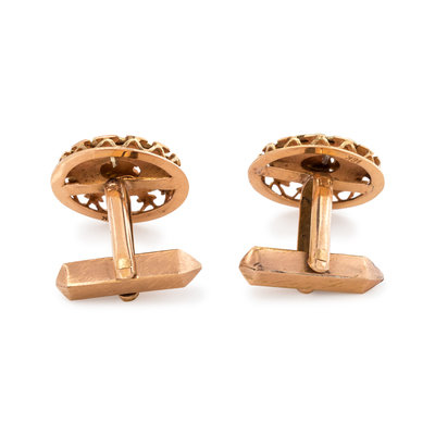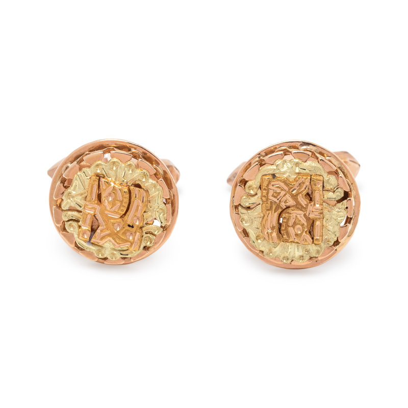Consisting of rose gold cufflinks surmounted with yellow and rose gold abstract motifs. 11/16 inch wide.