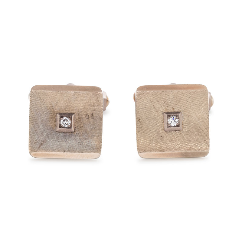 Consisting of square shaped cufflinks with Florentine and polished finish containing two round brilliant cut diamonds. 5/8 inch wide.
