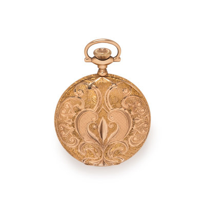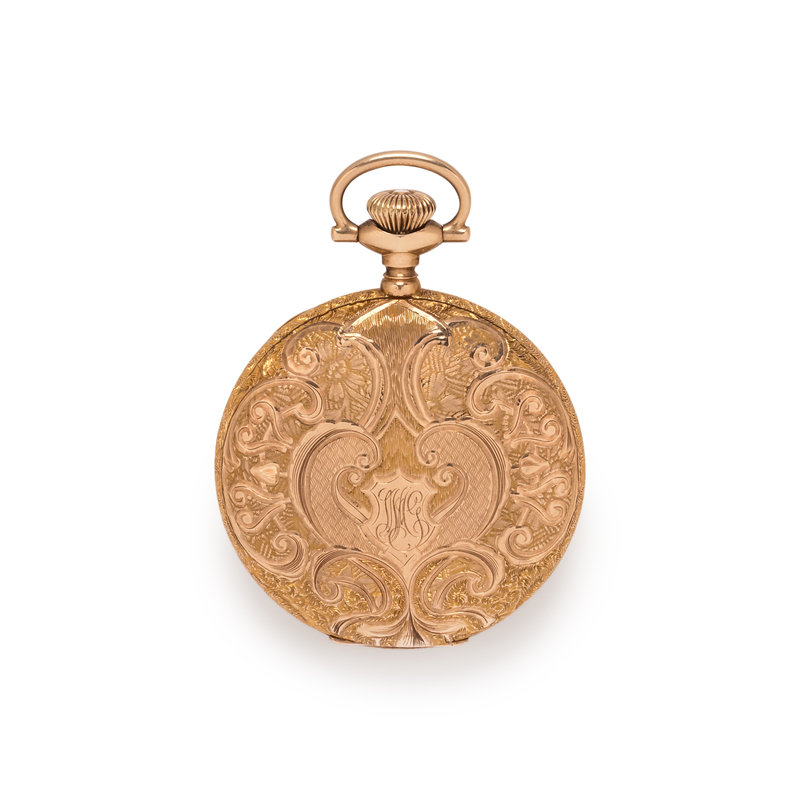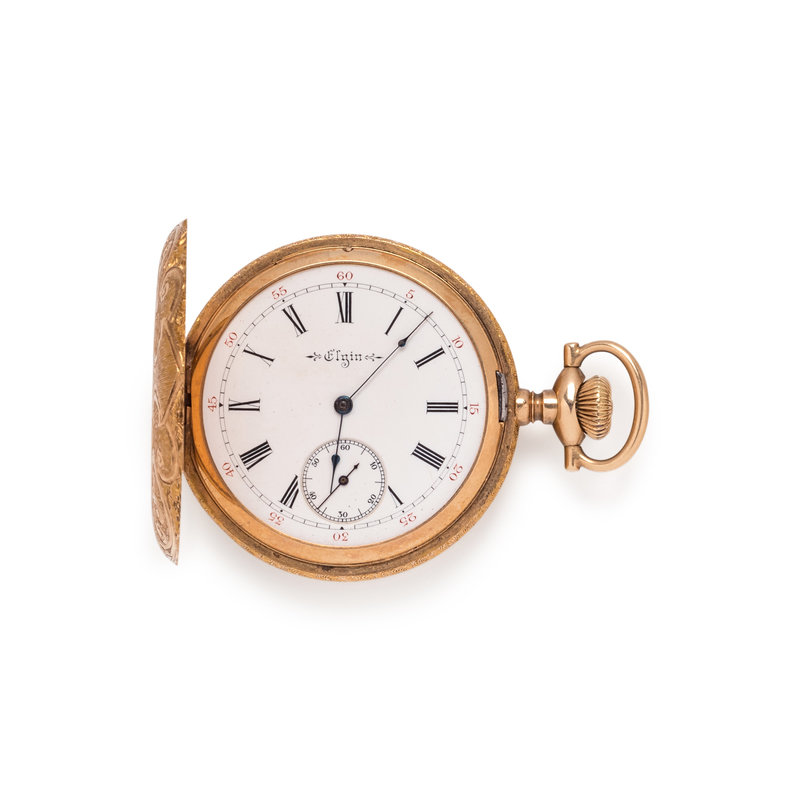 48.00 mm case diameter, white dial, black Roman numerals, subdial for seconds at 6 o'clock, stem wound and set 17 jewel nickel movement signed Elgin Nat'l Watch Co U.S.A., polished cuvette, foliate engraved case with monogram engraved cartouche.