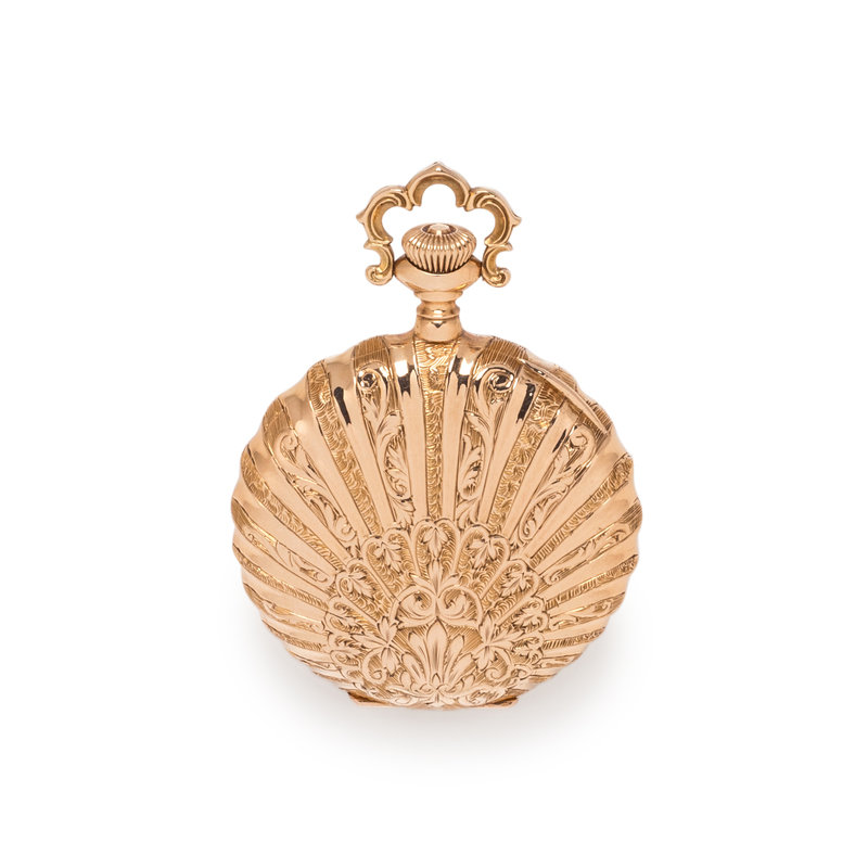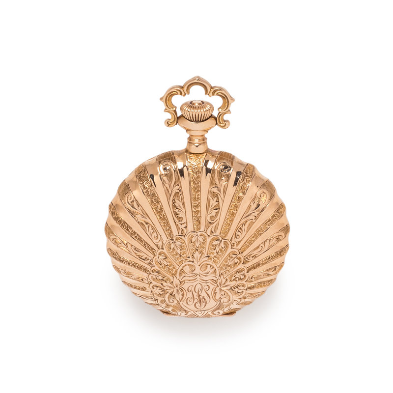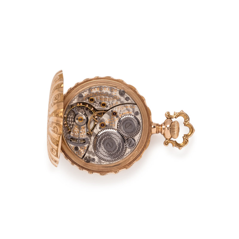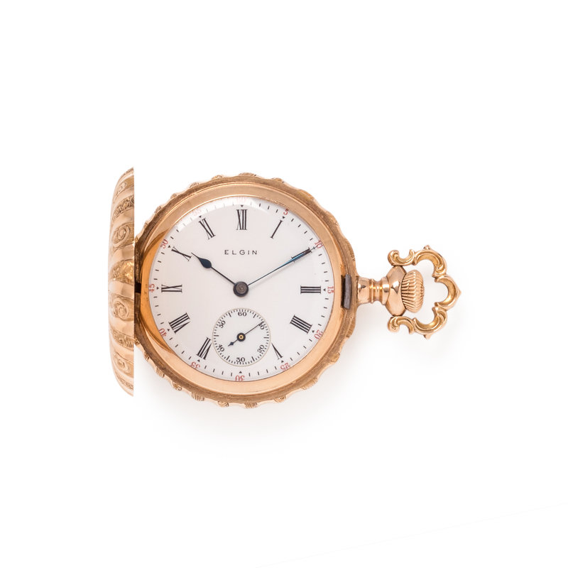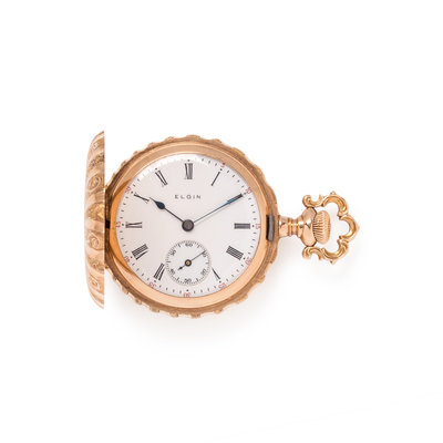 34.00 mm case diameter, white dial, black Roman numerals, subdial for seconds at 6 o'clock, stem wound and set 17 jewel nickel movement signed ELGIN NAT'L WATCH CO., foliate engraved case.