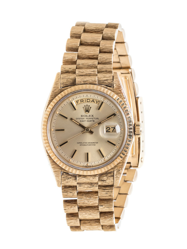 34.00 mm case diameter, fluted bezel, matte gold dial, applied gold baton numerals, center sweep seconds hand, date aperture at 3 o'clock with magnifier in crystal, day aperture at 12 o'clock, self-winding movement, bark texture Jubilee link bracelet, deployant clasp with Rolex logo. 7 1/2 inches inner circumference.