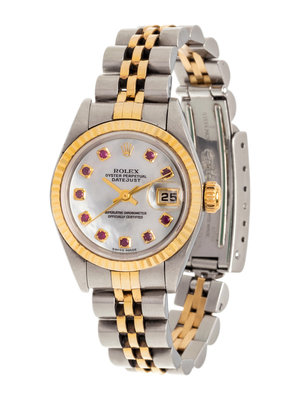 25.00 mm case diameter, dimpled mother-of-pearl dial, applied single cut ruby numerals, date aperture at 3 o'clock with magnifier in crystal, self-winding movement, steel and gold Jubilee link bracelet, deployant clasp. 5 3/4 inches inner circumference.