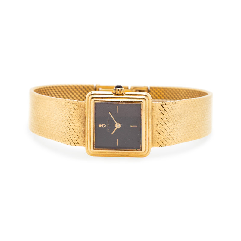 20.00 x 20.00 mm case dimensions, black dial, applied gold baton numerals, quartz movement, integrated textured mesh link bracelet, fold over clasp with Corum logo. 6 3/8-6 7/8 inches long.