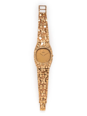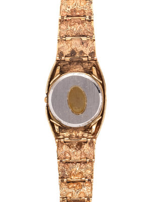 45.00 x 33.00 mm case dimensions inclusive of lugs, matte gold dial, applied gold baton numerals, quartz movement, integrated textured gold nugget motif flexible link bracelet, fold over clasp. 7-7 1/2 inches long.