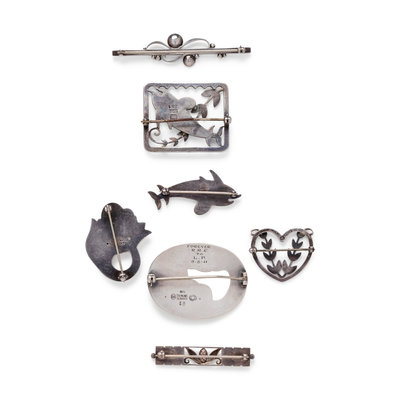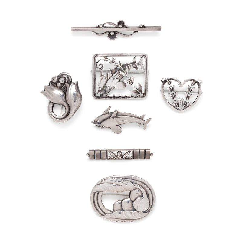 Consisting of a bar brooch style 216 A, a bar brooch style 234 B, a dolphin brooch style 317, a dolphin and leaf brooch style 251, a heart and leaf brooch style 242 B by Arno Malinowski, a leaf and berry motif brooch style 18, together with a tulip brooch style 100 A.