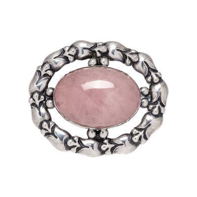 Containing one oval cabochon rose quartz measuring approximately 30.00 x 21.55 mm, with floral motif surround. 1 5/8 x 1 15/16 inches.