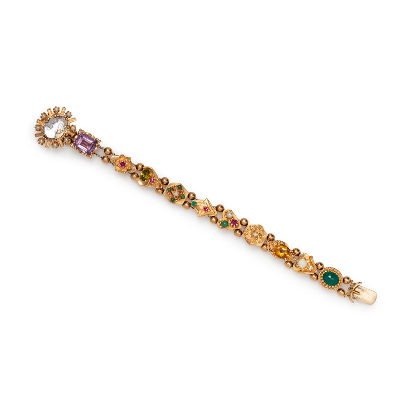 Consisting of 10 slide charms containing multiple gemstones of various shapes with gold sphere bead spacers, with a clasp containing one carved mother-of-pearl cameo. 7 1/8 inches long.