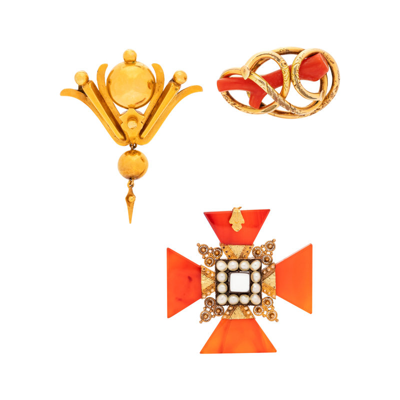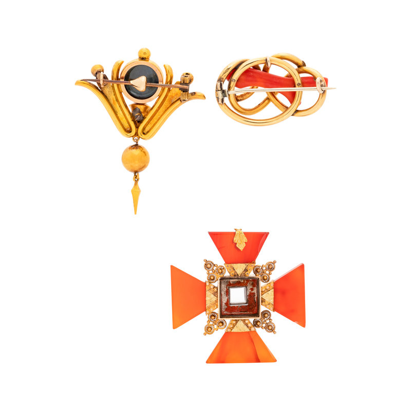 Consisting of a gold-filled brooch containing one branch coral, a gold-filled brooch with glazed compartment on the reverse, together with a gold-filled brooch with four pointed carnelian plaques and 12 pearls (origin not tested).