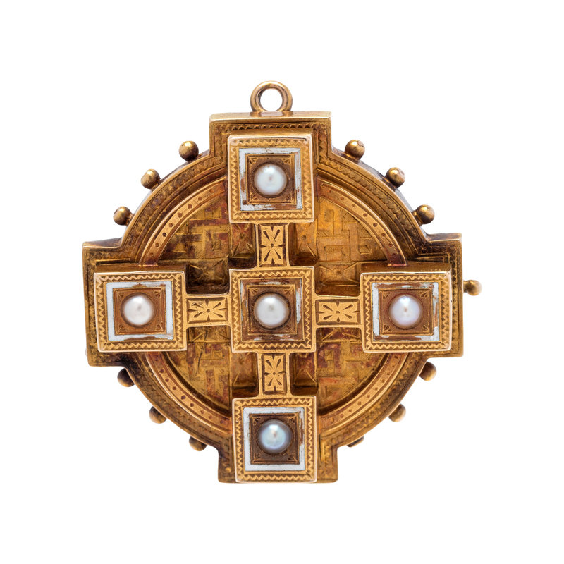 Consisting of an engraved design containing five pearls (origin not tested), with white enamel detail. 1 1/2 x 1 1/2 inches.