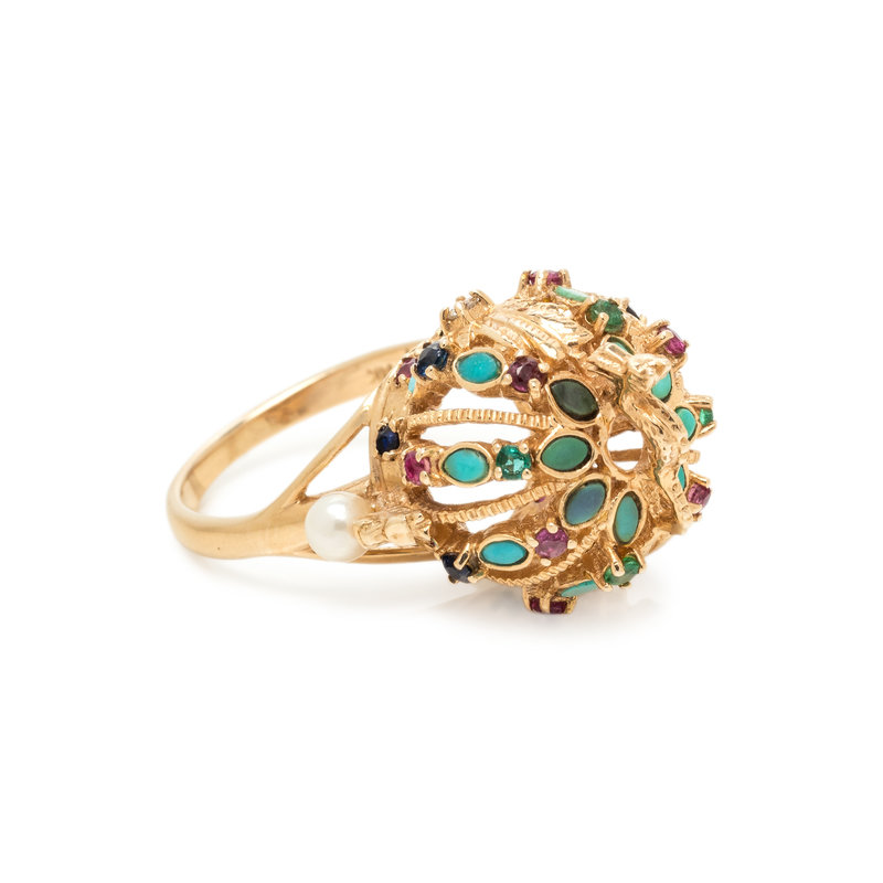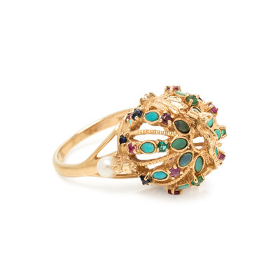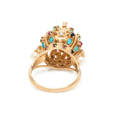 Consisting of an openwork domed design with dragon motifs containing two pearls (origin not tested), numerous marquise cabochon and round mixed cut gemstones and two diamonds. Ring size 7 1/4.