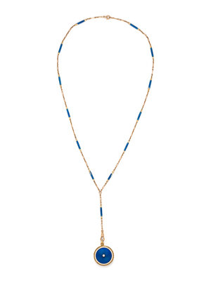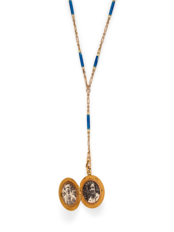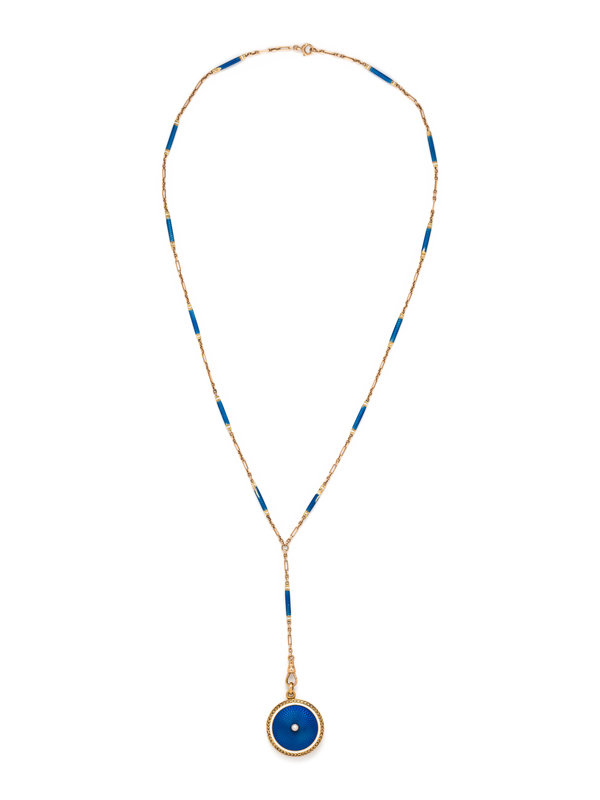 Consisting of a chain interspersed with blue and white enamel bar links suspending a blue and white guilloche enamel locket with engraved foliate motif surround containing one seed pearl. Mounted in yellow gold. 20 1/4 inches long.