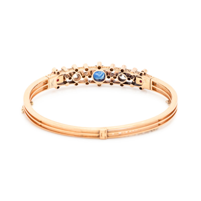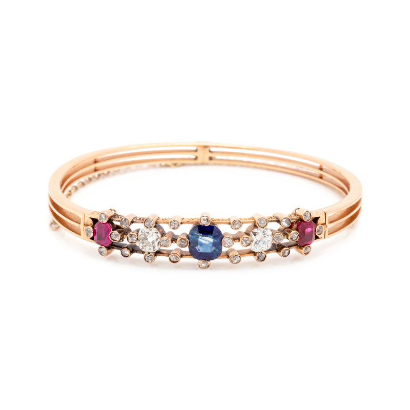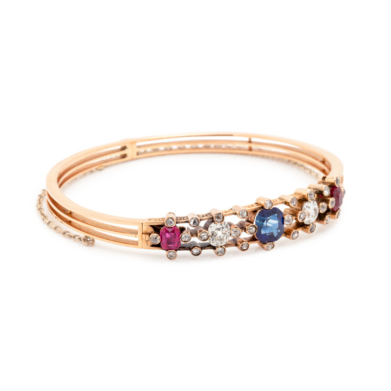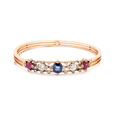 Containing one cushion mixed cut sapphire, two old mine cut diamonds weighing approximately 1.00 carat total, two cushion mixed cut rubies and 28 old mine and rose cut diamonds weighing approximately 0.85 carat total, hinged at back with two clasps. Mounted in rose gold. 7 inches inner circumference.