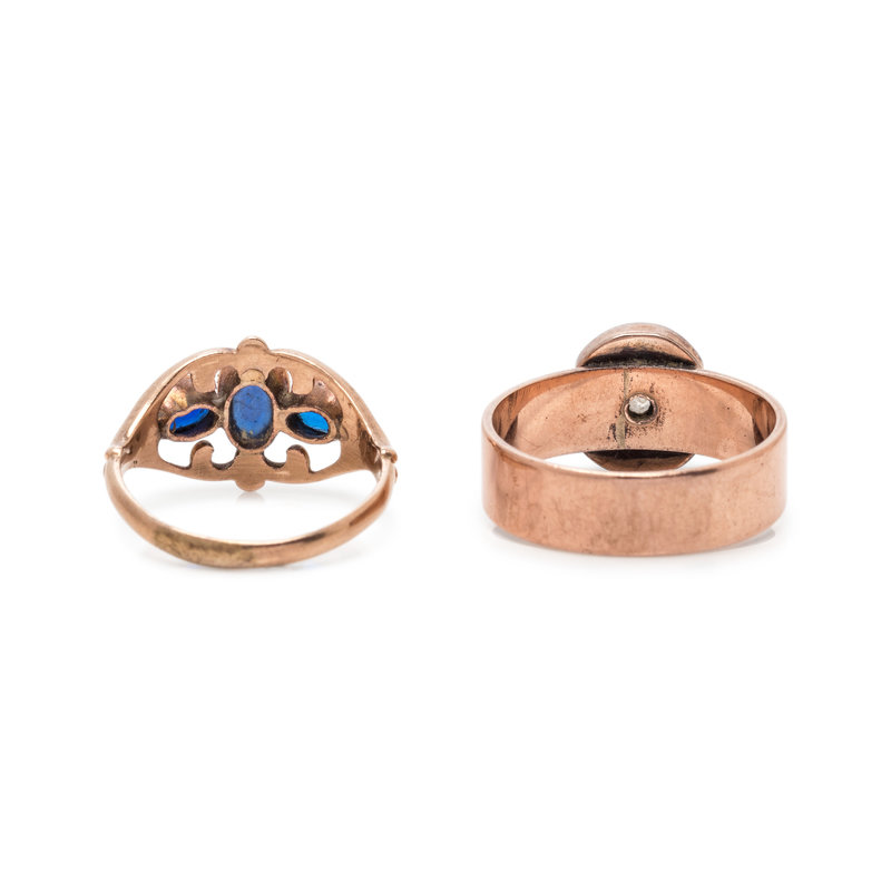 Consisting of a ring with open curling design containing three oval mixed cut paste rhinestones, together with a ring containing one old mine cut diamond and 10 blue hardstones. Mounted in rose gold. Ring sizes 6 1/4 and 7 3/4.