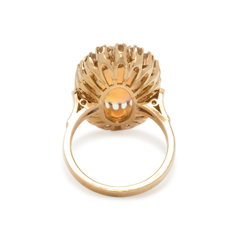 Containing one oval cabochon opal measuring approximately 19.50 x 9.70 mm and 20 round brilliant cut diamonds weighing approximately 0.75 carat total. Mounted in yellow gold. Ring size 6 3/4.