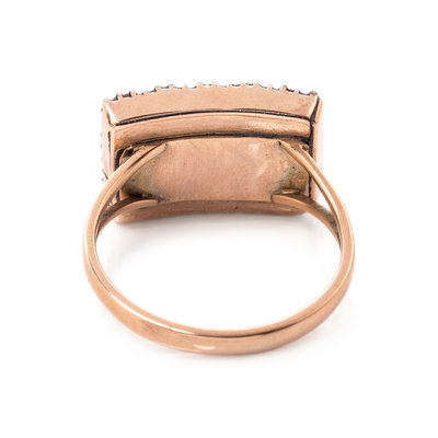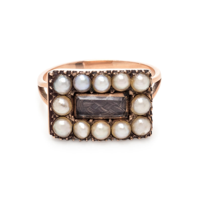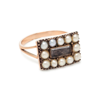 Containing 12 pearls (origin not tested) measuring approximately 3.00 mm in diameter, surrounding a central glazed compartment containing woven hair. Mounted in rose gold. Ring size 6 3/4.