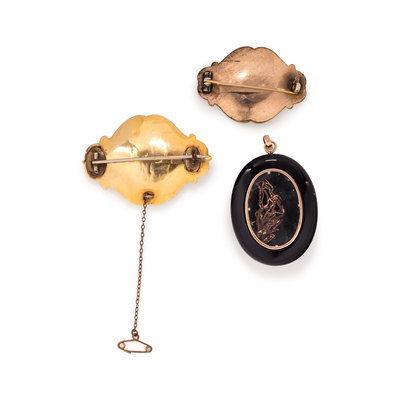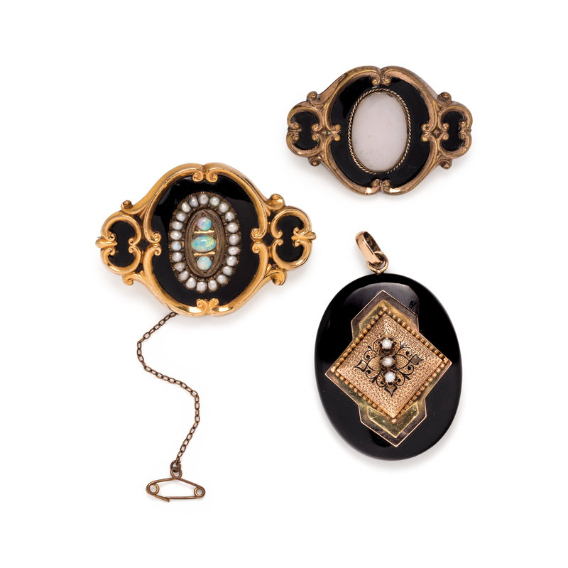 Consisting of a carved onyx pendant surmounted with a gold-filled taille d'epergne enamel plaque containing three seed pearls, the reverse with glazed compartment, a gold-filled brooch with black enamel and central glazed compartment, together with a gold-filled brooch with black enamel, three cabochon opals and 22 pearls (origin not tested).