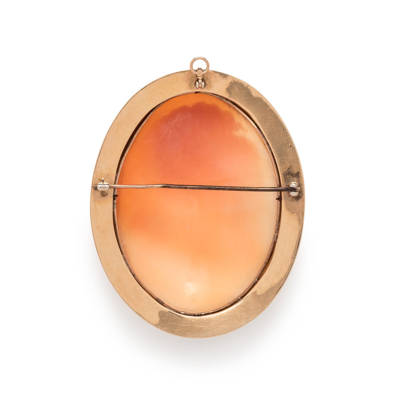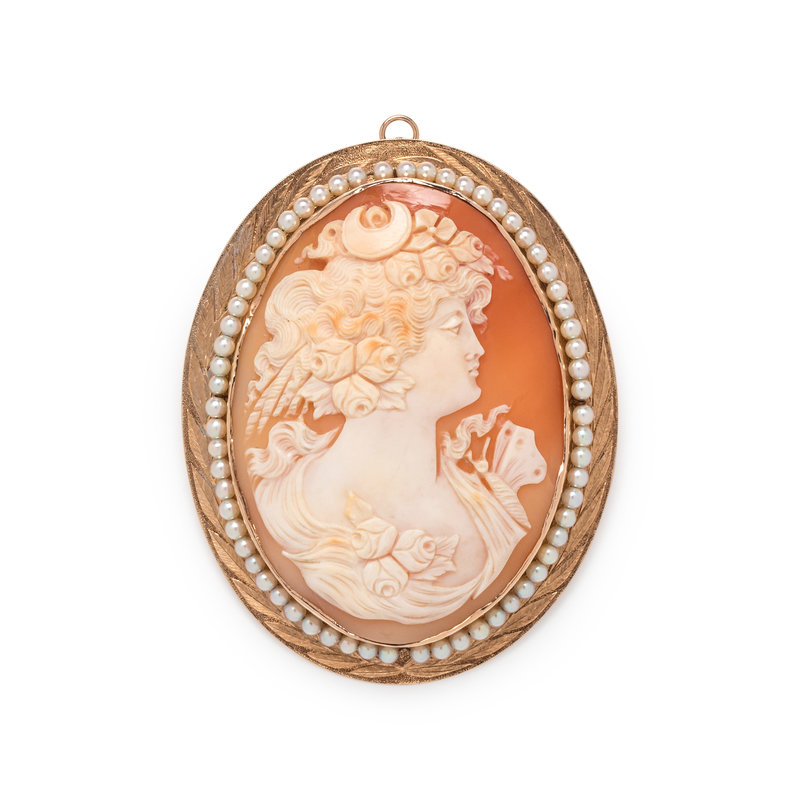 Containing one oval carved cameo depicting the goddess of the moon, Selene, measuring approximately 58.00 x 42.00 mm, with a cultured pearl surround. Mounted in rose gold. 2 3/4 x 2 3/16 inches.