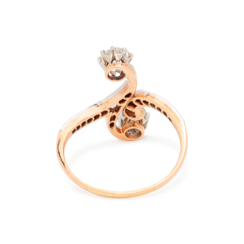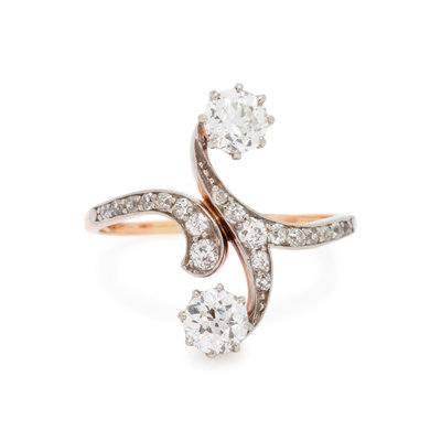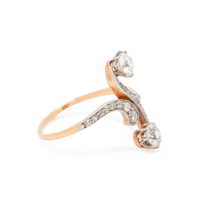 Containing two old European cut diamonds weighing approximately 0.90 carat total and 19 old mine and mixed cut diamonds weighing approximately 0.20 carat total. Mounted in platinum-topped gold. Ring size 7 1/2.
