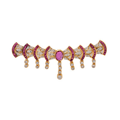 Containing one oval mixed cut ruby measuring approximately 6.45 x 4.95 x 1.80 mm, 56 French cut rubies and 80 round brilliant cut diamonds weighing approximately 1.00 carat total. Mounted in yellow gold. 7/8 inch x 2 7/16 inches.