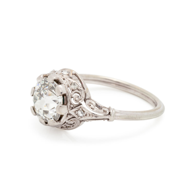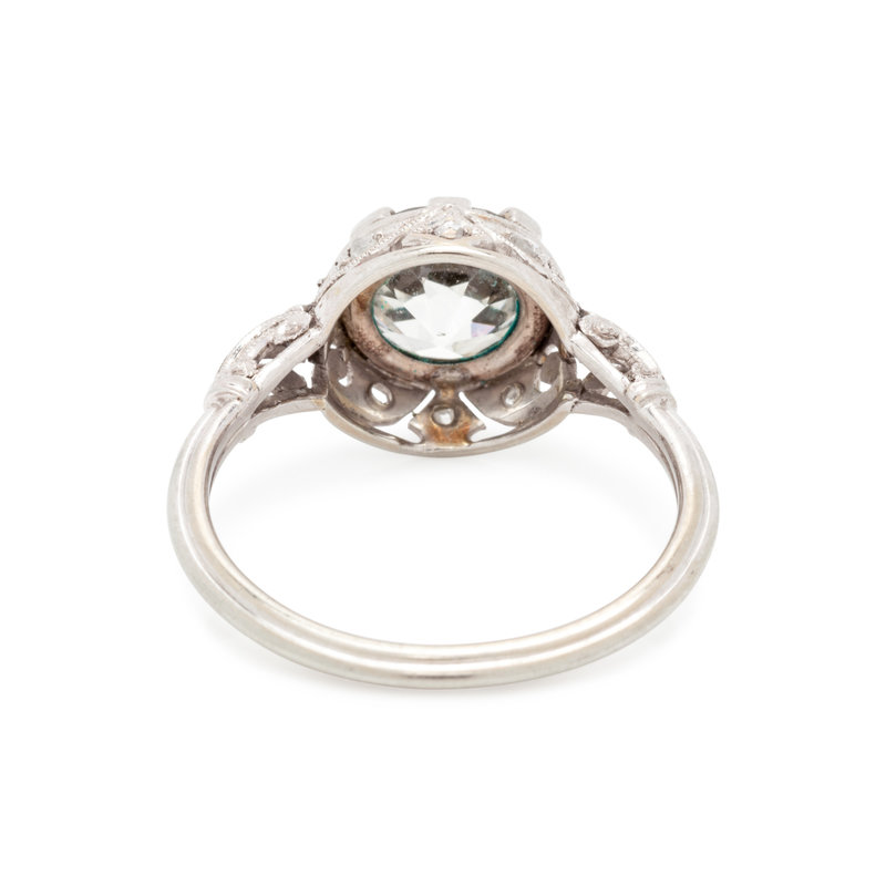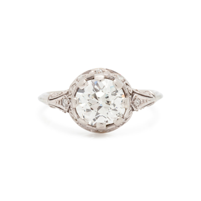 Containing one old mine cut diamond weighing approximately 1.95 carats and eight mixed cut diamonds. Mounted in platinum. Ring size 7.