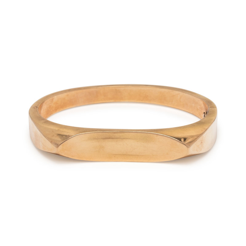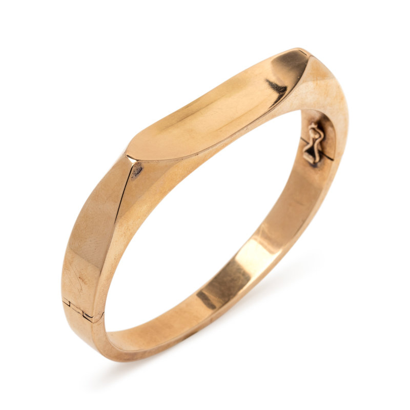 Consisting of a bangle with concave top, hinged with side clasp. 6 5/8 inches inner circumference.