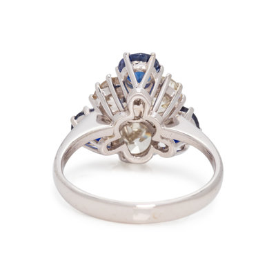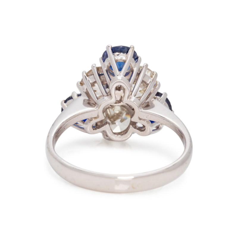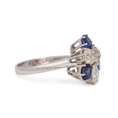 Containing three old mine cut diamonds weighing approximately 1.50 carats total, one single cut diamond and three round mixed cut sapphires. Mounted in white gold. Ring size 7 1/2.
