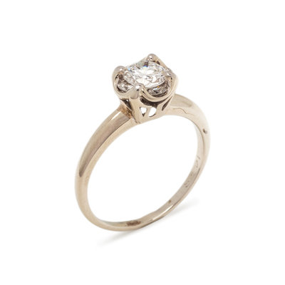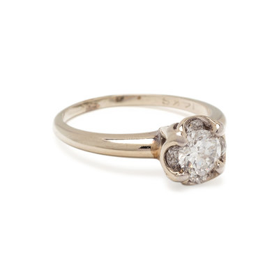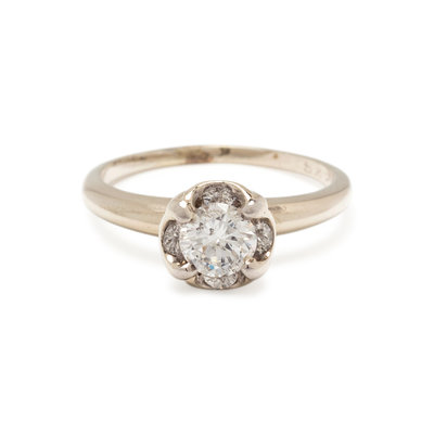 Containing one round brilliant cut diamond weighing approximately 0.65 carat and four round brilliant cut diamonds. Mounted in white gold. Ring size 7 1/2.