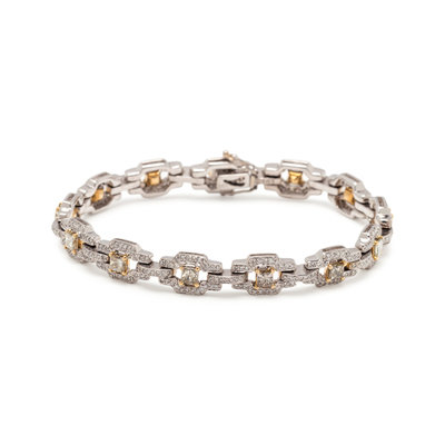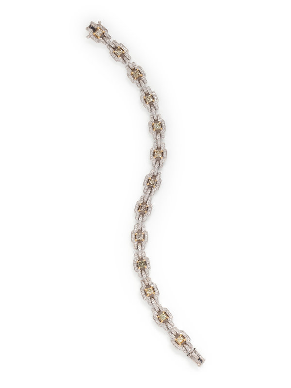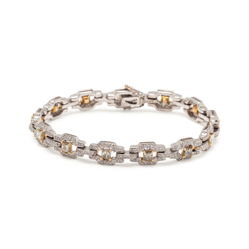 Containing 13 princess cut yellow diamonds (origin of color not tested) weighing approximately 2.64 carats total and numerous round brilliant cut diamonds weighing approximately 1.81 carats total. Mounted in white gold. 7 1/8 inches long.