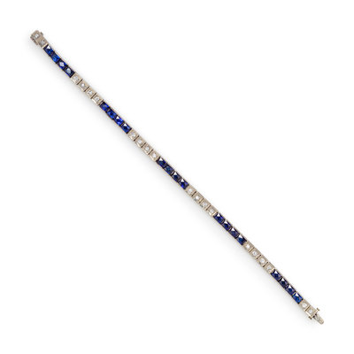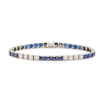 Containing 20 old mine and transitional cut diamonds weighing approximately 0.90 carat total and 20 French cut synthetic sapphires. Mounted in white gold. 7 7/8 inches long.
