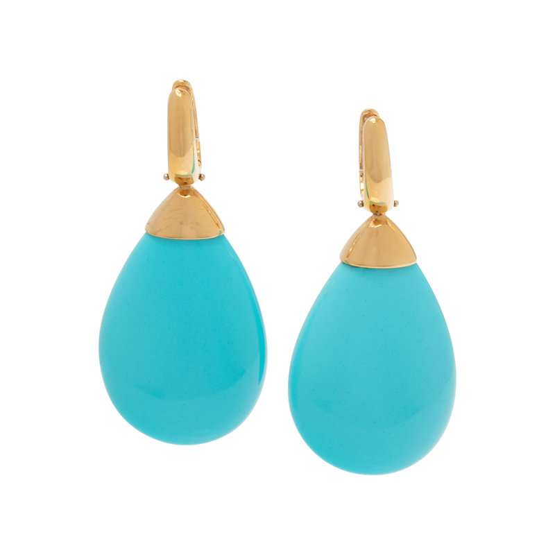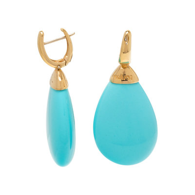 Containing two pear shaped synthetic turquoise drops measuring approximately 35.00 x 24.00 mm. Mounted in yellow gold. 2 1/8 inches long.