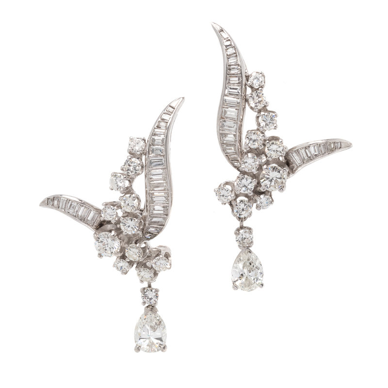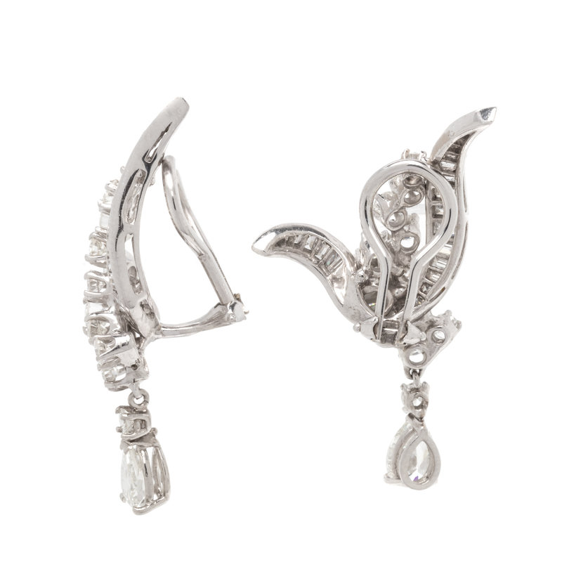 Containing 24 round brilliant cut, 42 baguette cut and two pear shaped diamonds weighing approximately 3.40 carats total. Mounted in platinum. 1 1/2 inches long.