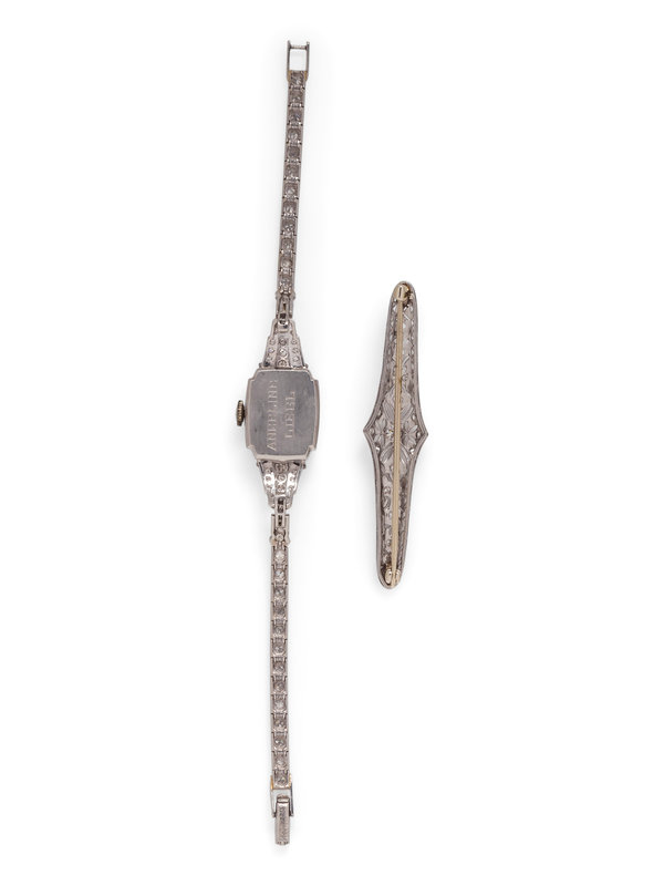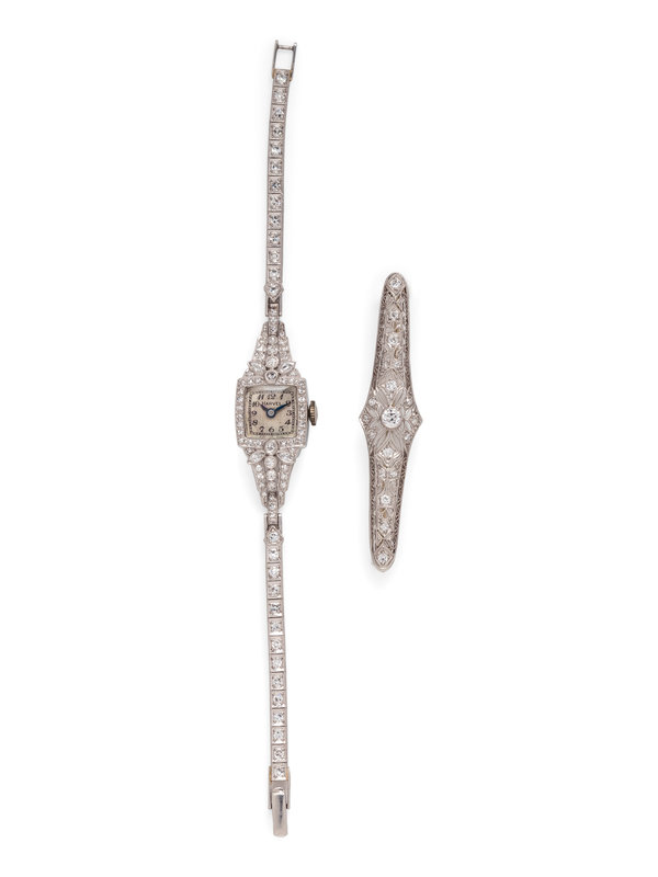 Consisting of an antique brooch containing 19 transitional, old European and single cut diamonds, together with a wristwatch containing four marquise and numerous single cut diamonds, off white dial, black Arabic numerals, 17 jewel manual wind movement signed HARVEL WATCH Co SWISS, flexible link bracelet, fold over clasp. Brooch: 7/16 inch x 2 3/16 inches. Wristwatch: 5 3/4 inches long.