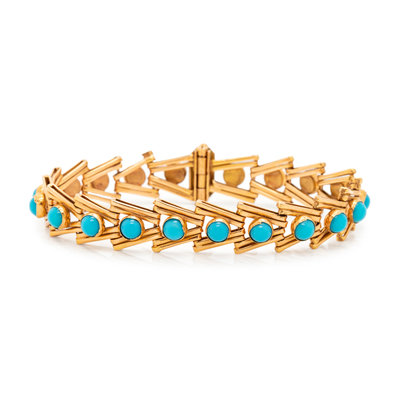 Containing 20 round cabochon turquoise measuring approximately 4.65-4.80 mm in diameter. 7 1/2 inches long.