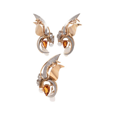 YELLOW GOLD, PLATINUM, CULTURED PEARL AND CITRINE SET