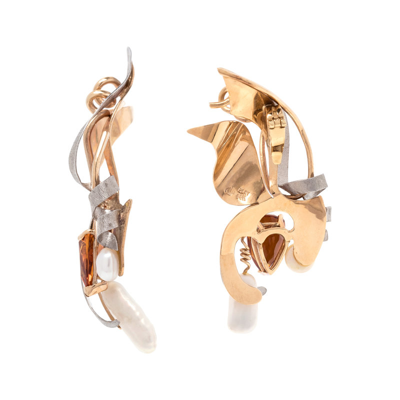 Consisting of a pendant containing one Baroque pearl, one round pearl and one pear mixed cut citrine in a swirling design, together with a pair of earrings containing two Baroque pearls, two round pearls and two pear mixed cut citrines. Pendant: 2 1/4 inches long. Earrings: 2 inches long.