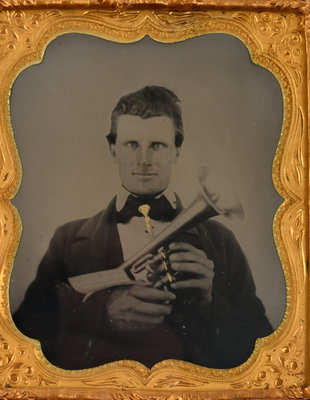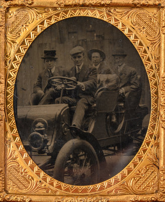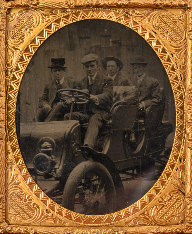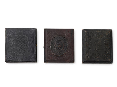 an example depicting a horn player in an embossed leather case; an example depicting four men in a car in an embossed leather case lacking its cover and the example depicting an artist in an embossed leather case lacking its cover.