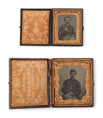 Two Seated Soldier Cased Tintypes with Gilt Embellishment