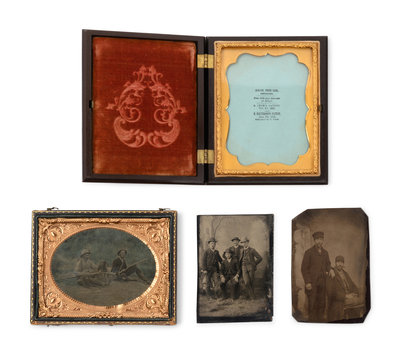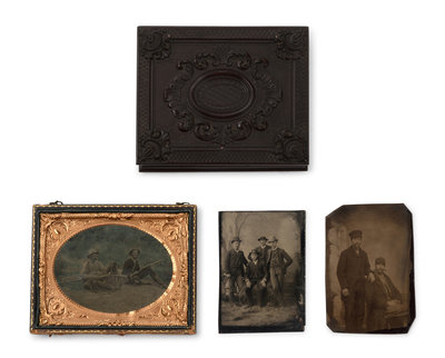 comprising an example in an embossed case, two loose examples and an associated quarter plate union case.
