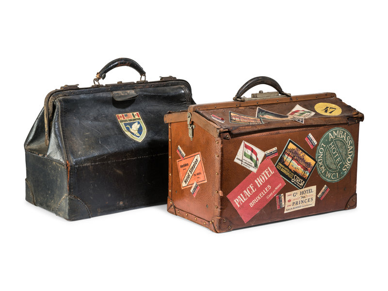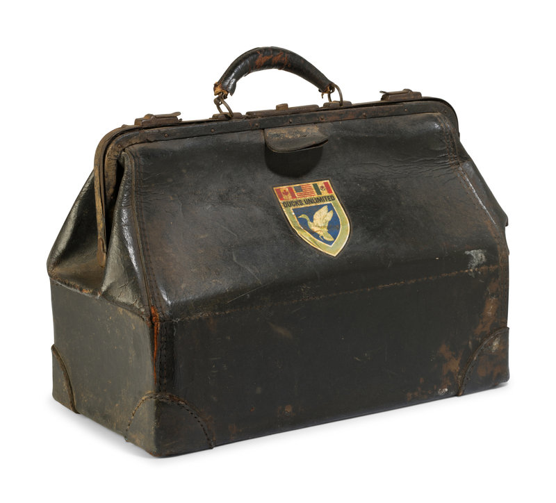 one example with a Duck Unlimited label and the other with several travel stickers.