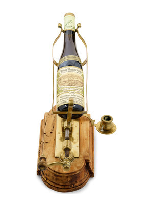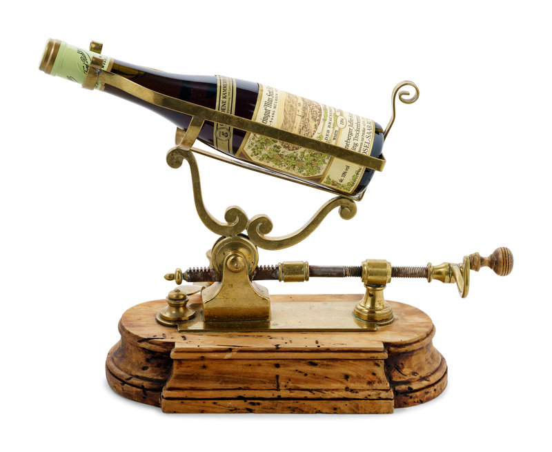 An English Brass and Walnut Port and Wine Bottle Mechanical Decanter