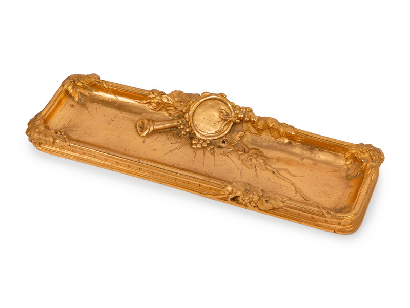comprising a pen tray, a large ink stand, a service call button, a paperweight, a stamp box, a scale and a letter rack; 7 items total.