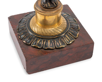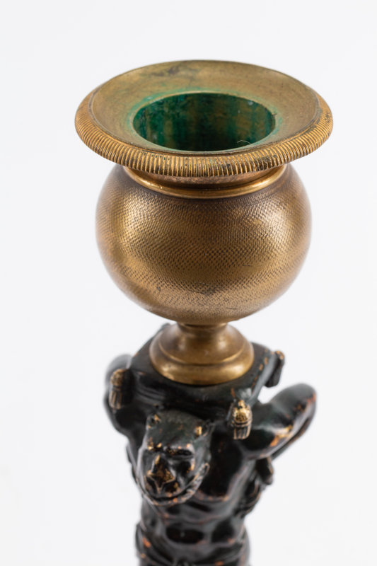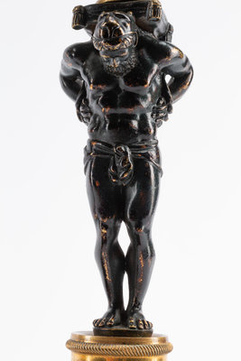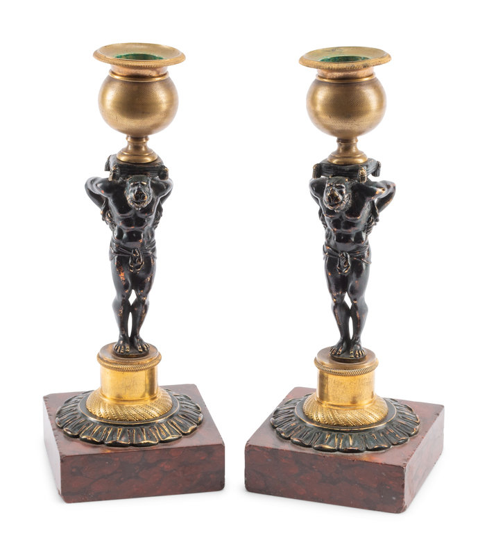 A Pair of French Gilt and Patinated Bronze and Marble Figural Candlesticks in the Form of Atlas