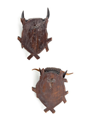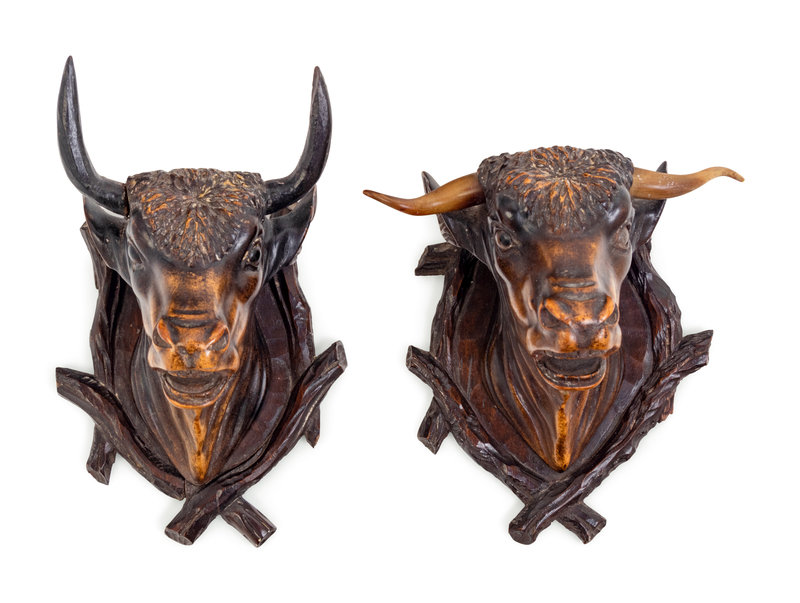 A Pair of Black Forest Carved Wood Bull Wall Mounts