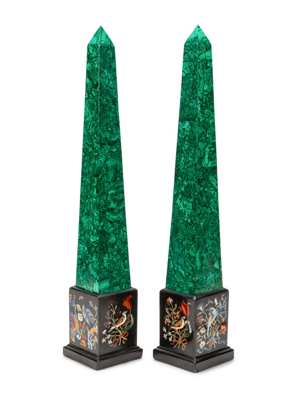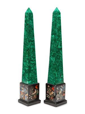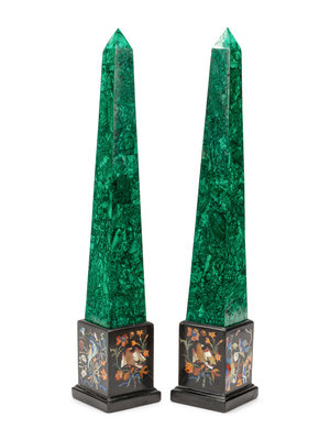 A Pair of Malachite Veneered Obelisks on Specimen Marble Bases