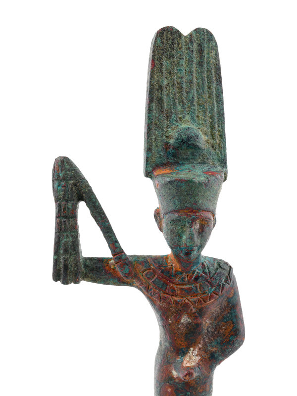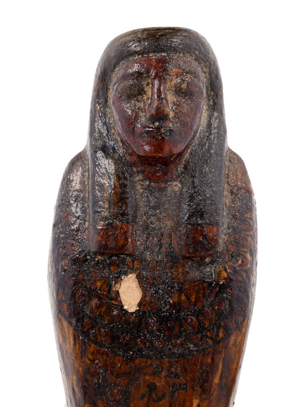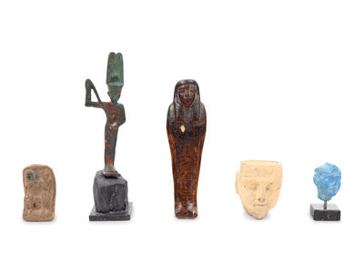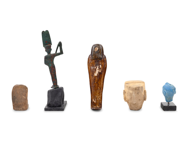 comprising a wood ushabti, two Pharaonic heads, a pair of statues and a statue of Amun-Ra.