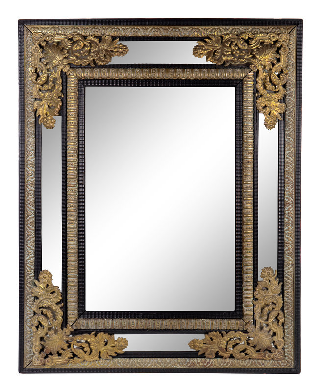 A Dutch Baroque Style Repousséd Brass-Mounted Rectangular Mirror