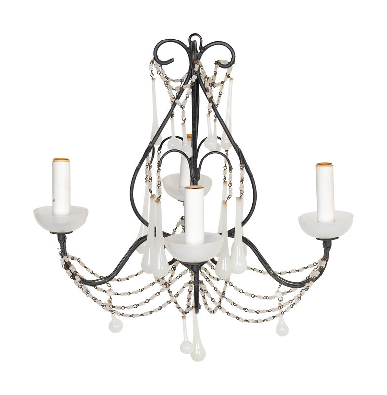 A Rococo Style Wrought-Iron and Opaline Glass Four-Light Chandelier