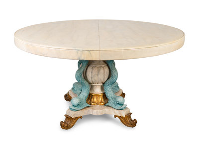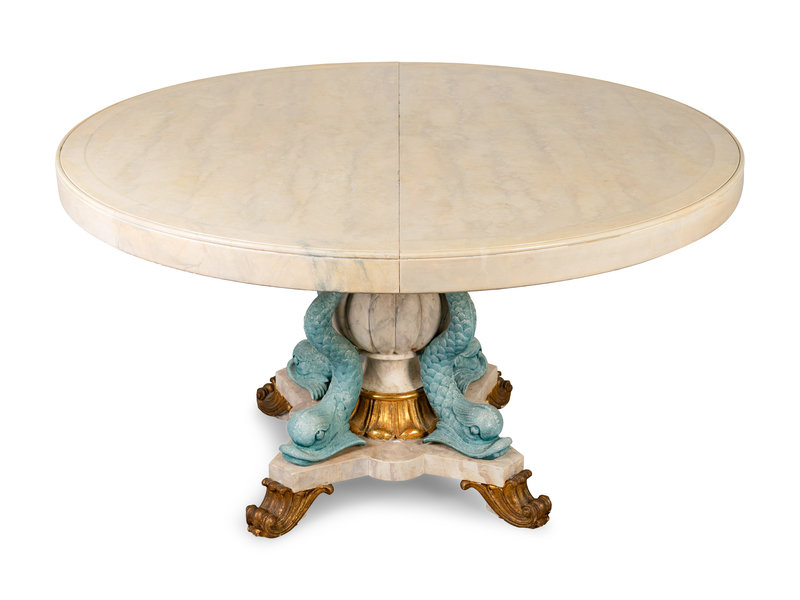 the circular top painted to simulate marble, with dolphin supports.